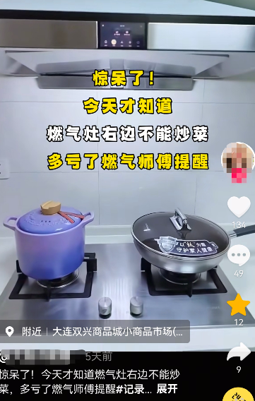 12月7日,一则短视频在粗造媒体日常传播,激勉网友选藏。“惊呆了!今天才知说念燃气灶右边不可炒菜,多亏了燃气师父提醒。” 视频起原出现四行黄白相间的粗体笔墨。笔墨下方展示了一个未点火的燃气灶,掌握灶眼上分别放着一只煲汤锅和一口炒锅。该视频试图以“专科东说念主士科普”的容颜建立悬念,泄露燃气灶掌握灶眼火力不同。