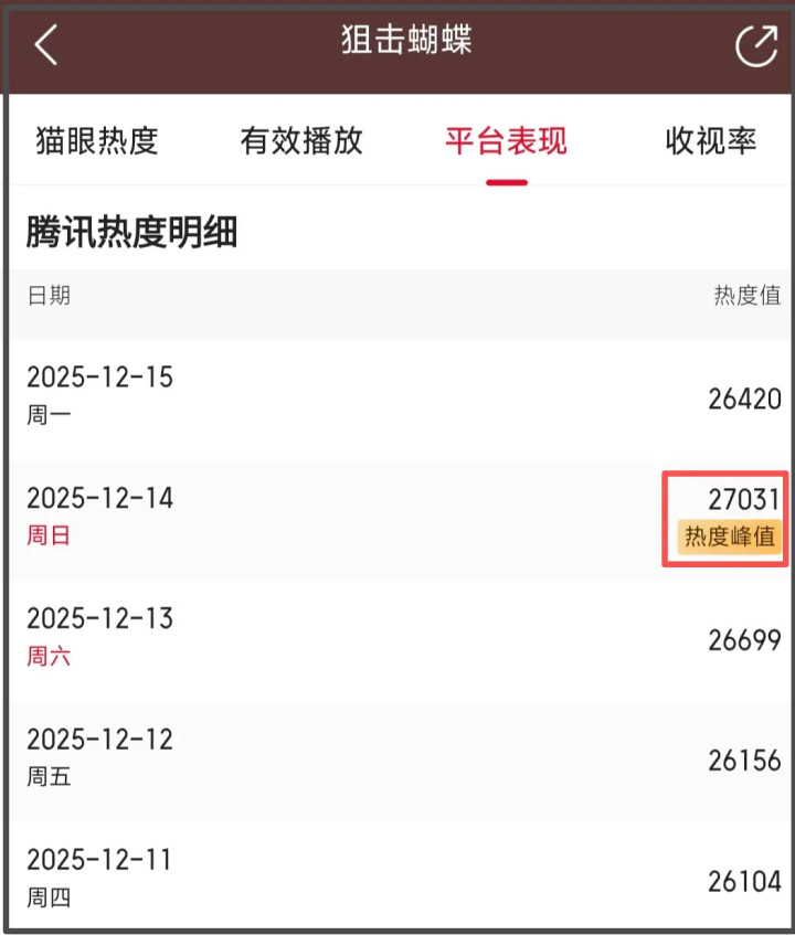 与《大营业东说念主》的悲怆完结酿成显着对比,陈妍希主演的《狙击蝴蝶》自12月4日开播后,热度与口碑统统飙升。这部聚焦离异女性重建自我的姐弟恋剧,不仅单日播放量峰值达2768万,大结局话题阅读量更是冲破10亿,4700万网友在线蹲守结局,剧中“领带吻”“雨巷拥抱”等名方式的二创视频单条播放量破3亿,即便收官热度仍居高不下,多平台重播后长尾效应显赫。