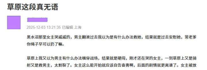 更离谱的是,剧中充斥着诸多悬浮情节,比如男主在战火纷飞的战场穿行毫发无伤,女主堕入池沼脱困后能坐窝骑马救东说念主,被俘后还被敌军王妃善待认作干男儿,主角光环重到让不雅众直呼“智力受辱”。