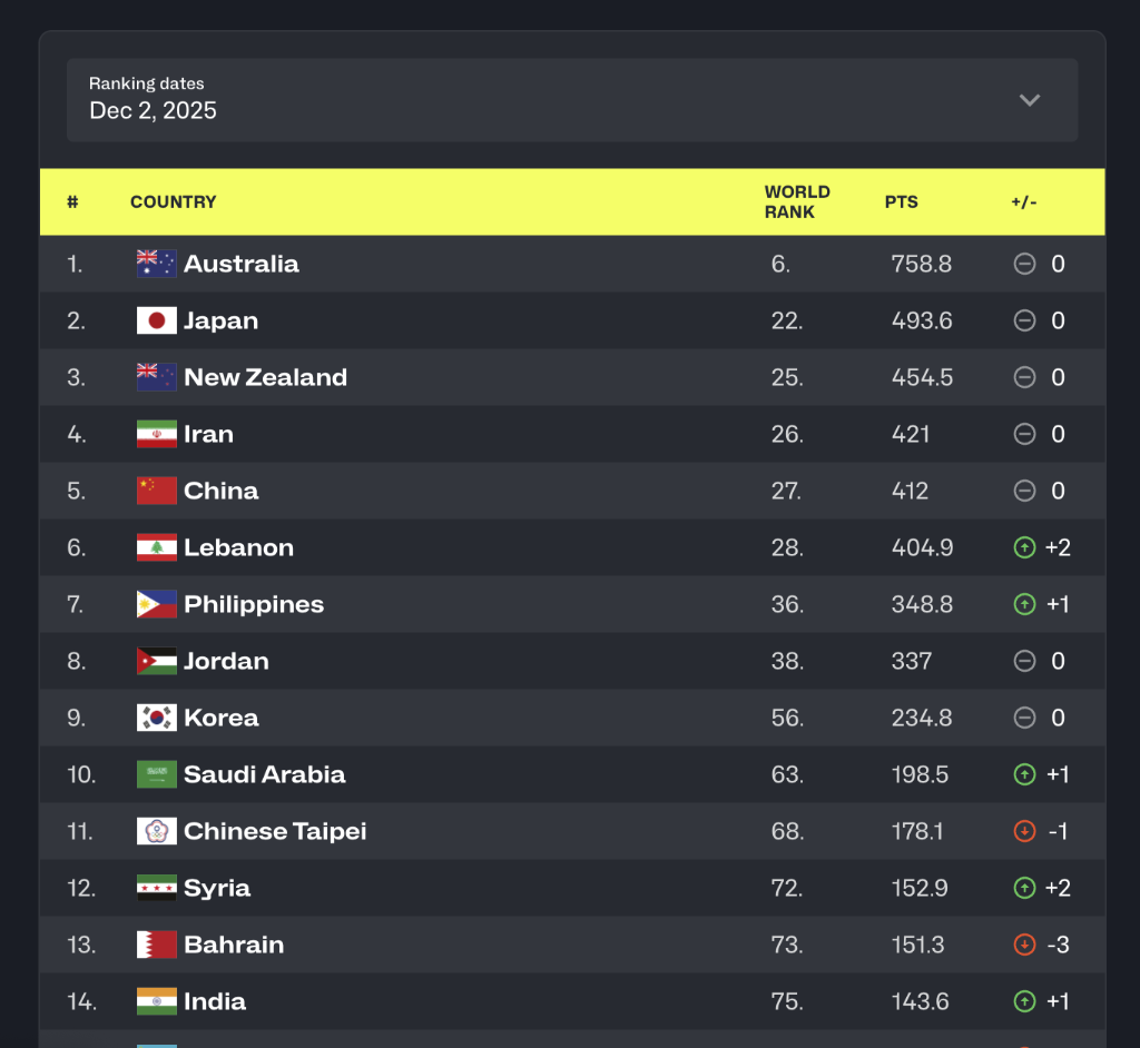 亚洲球队中,排行最高的仍然是澳大利亚队(寰宇排行第六),其次别离为日本队、新西兰队和伊朗队,中国队位列亚洲区第五。