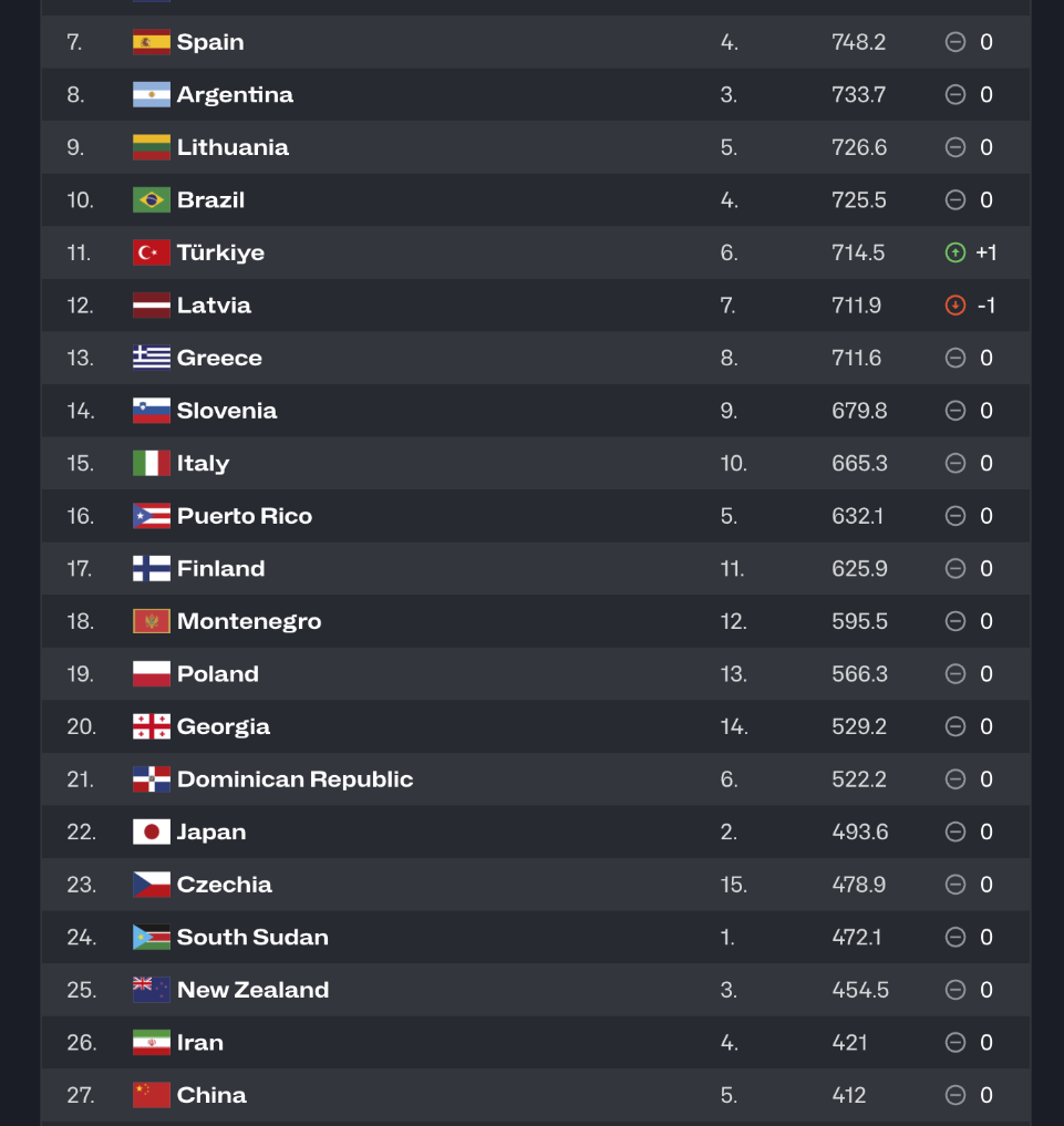 寰宇男篮前十名依旧为:好意思国、德国、塞尔维亚、法国、加拿大、澳大利亚、西班牙、阿根廷、立陶宛和巴西。土耳其进步拉脱维亚升至第11位,拉脱维亚降至第12位。