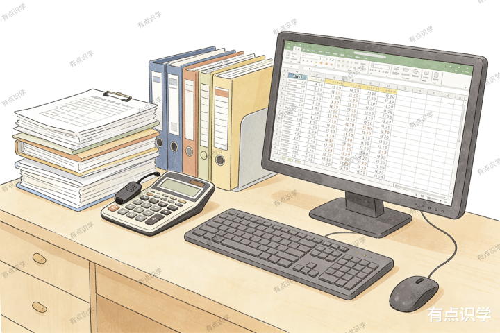 场景:桌面整都地摞着文献夹、计较器,电脑屏幕上是Excel表格