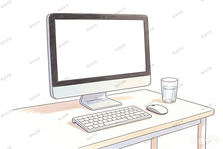 场景:一张干净、极简、唯有一台大表示器(可能是竖屏)、一个键盘、一个鼠标、一杯水的工位。